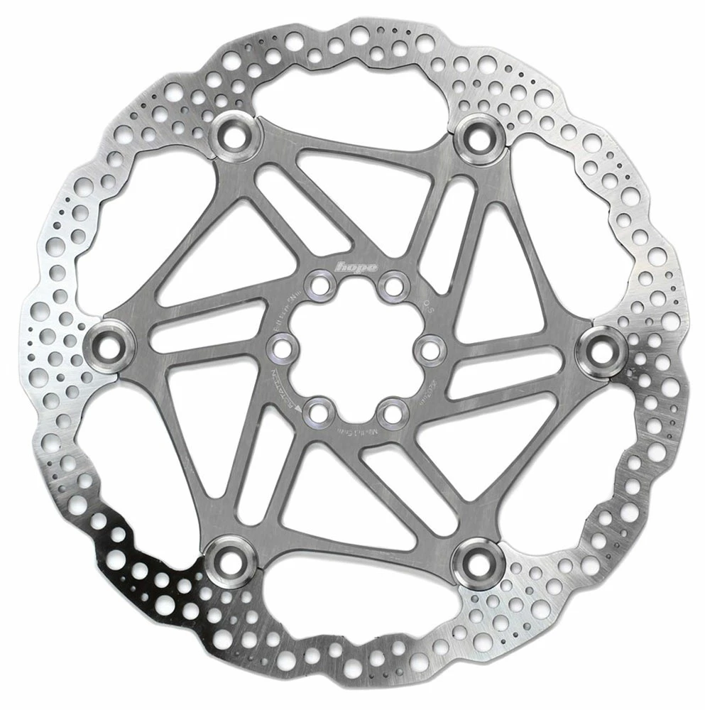Hope’s Floating 6-Loch Scheibenbremsen sind unter Mountainbiker beliebt, da sie die Leistung optimieren und einfach auffallend sind. Die Bremsfläche aus Edelstahl wird zum Aluträger genietet. Diese Konstruktion spart Gewicht und die Scheibe darf sich bei Wärme ausdehnen und zusammenziehen, ohne verformt zu werden.