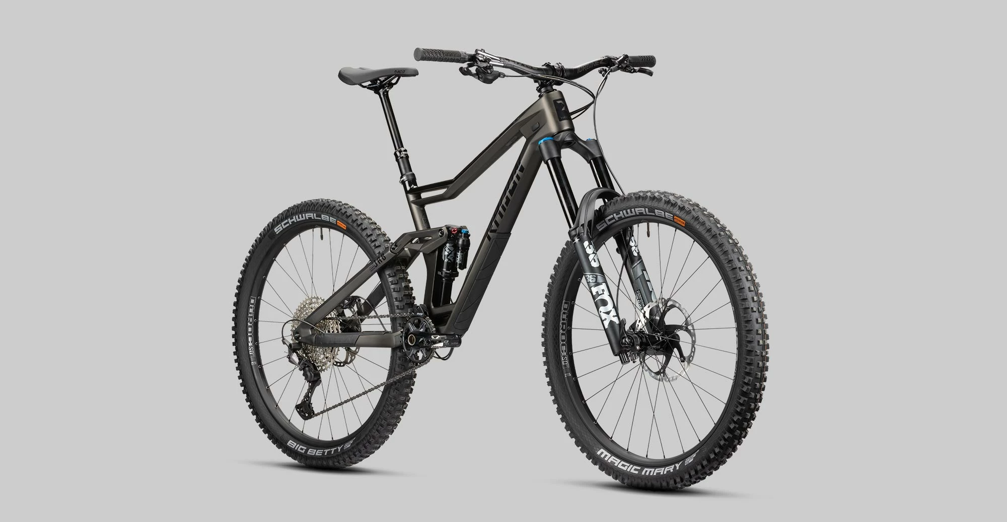 Grundlage dafür ist der JAB High-End-Vollcarbonrahmen, der mit seinen ca. 2.200 Gramm sehr leicht ausfällt für ein Enduro und dabei auch noch eine einzigartige Formensprache aufweist. Der Hinterbau im Zusammenspiel mit dem auf ihn abgestimmten Fox Float X Performance Elite Dämpfer liefert sensible 160mm Federweg, die im groben Geläuf aber Reserven mitbringen. Passend dazu arbeitet vorne die Fox 36 Float Performance Elite Federgabel mit der superben Grip2 Kartusche und liefert 170mm Travel. In perfekter Balance mit dem Hinterbau spricht sie feinfühlig an und steht bei schnell aufeinander folgenden Schlägen und Stufen hoch im Federweg, um Dir absolute Sicherheit zu vermitteln. Für lange Anstiege packen wir eine Shimano XT 1×12 Schaltung ans JAB, die mit ihrer großen, 10-51 Zähne umfassenden Kassette den Weg ebnet auch bei der fiesesten Steigung, aber auch für die Abfahrt mehr als ausreichend Druck auf’ s Pedal zulässt. Aus dem gleichen Hause und mit dem gleichen XT Label versehen kommt die Bremse daher und ist mit ihren vier Kolben hinten und vorne die Benchmark bei Standfestigkeit und Zuverlässigkeit. Im technisch anspruchsvollen und steilen Gelände begeistert das breite RaceFace Cockpit mit überragender Kontrolle, die vom Lenker aus versenkbare Radon Competition Variostütze gibt Dir zusätzlich Bewegunsgfreiheit, wenn Du sie benötigst. Die recht leichten SUNringlé Düroc SD37 Expert Komplettlaufräder sind unverwüstlich mit ihrer Stahlachse und machen jeden Drop mit, für maximalen Grip montieren wir darauf die downhillfeste Schwalbe Kombination Magic Mary und Big Betty. JAB 10.0 knallt!